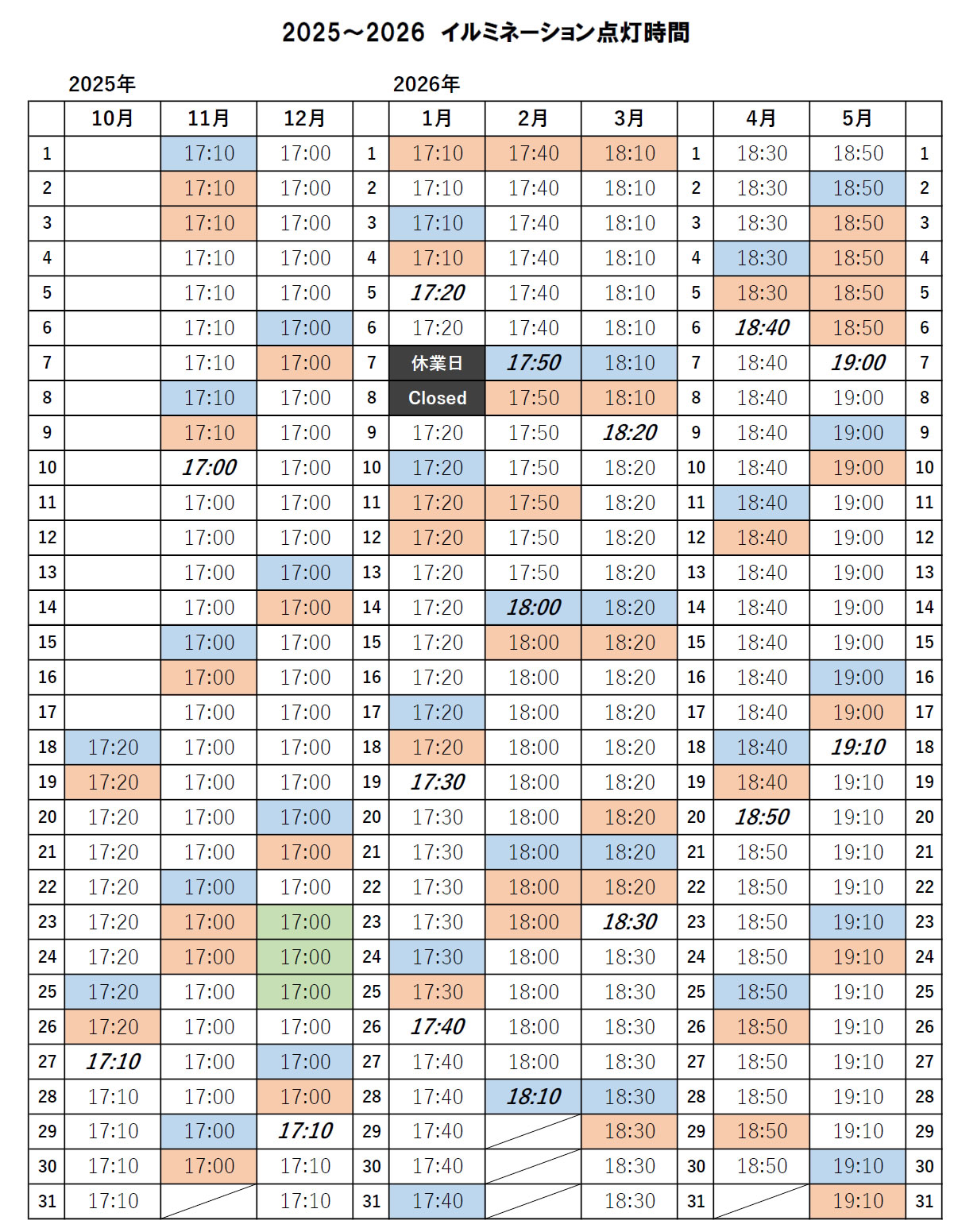 美しくご覧いただくため、日没時間に合わせ点灯時間は変動いたします。