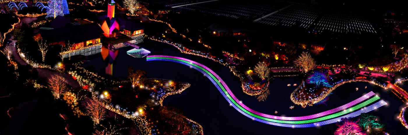 "Hikari-no-taiga"(great river of light) is the largest in Japan with illumination on the water.It expresses a shining light river with a scale of about 8 m in width and about 130 m in length.