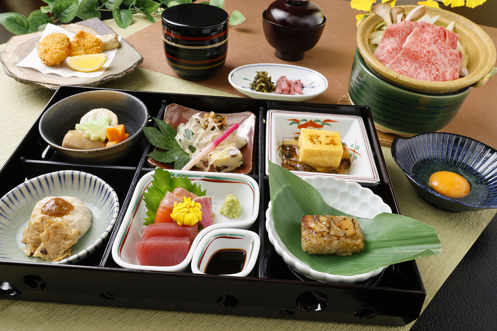 お品書き:松花堂弁当/黒毛和牛すき焼き/揚げ物/ご飯/味噌汁/香物/デザート