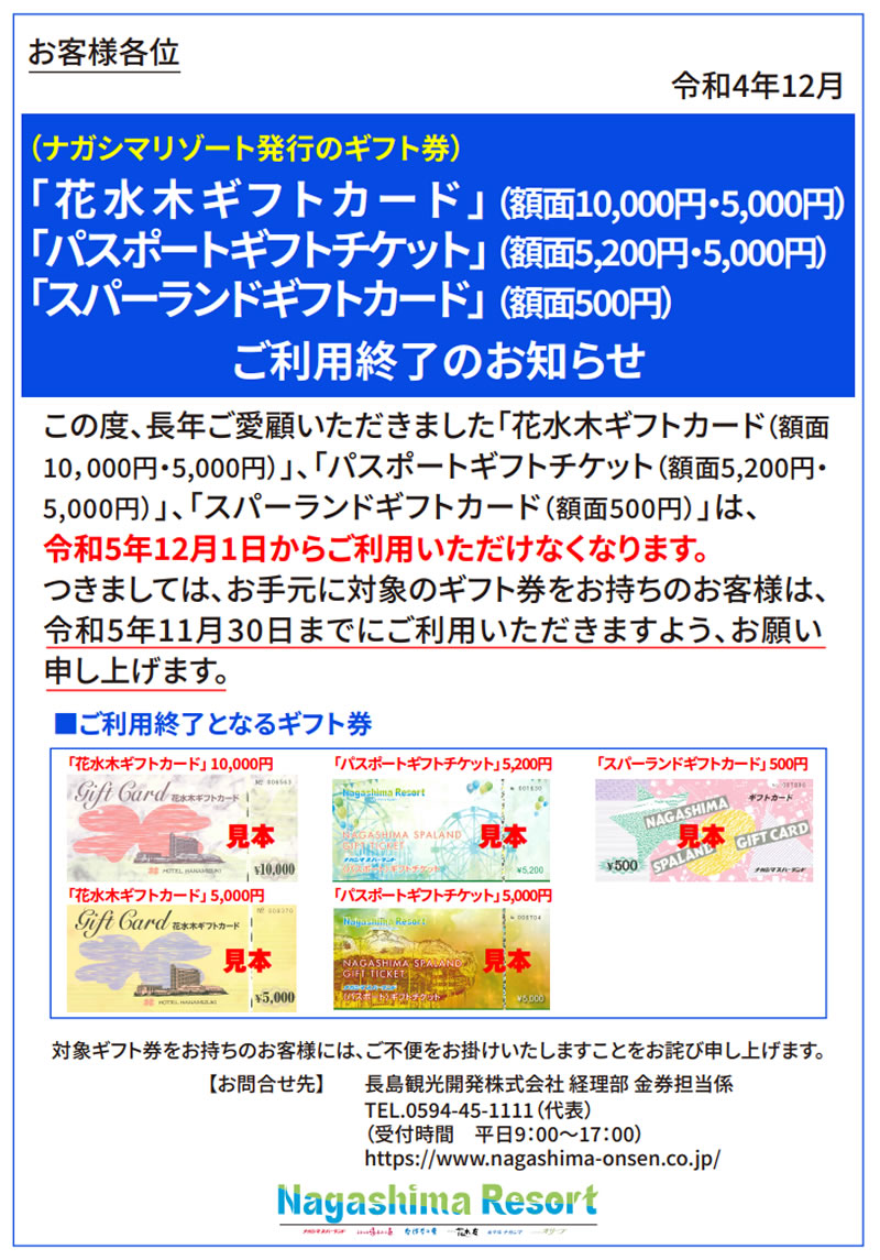 花水木ギフトカード・パスポートギフトチケット、スパーランドギフトカード ご利用終了のお知らせ