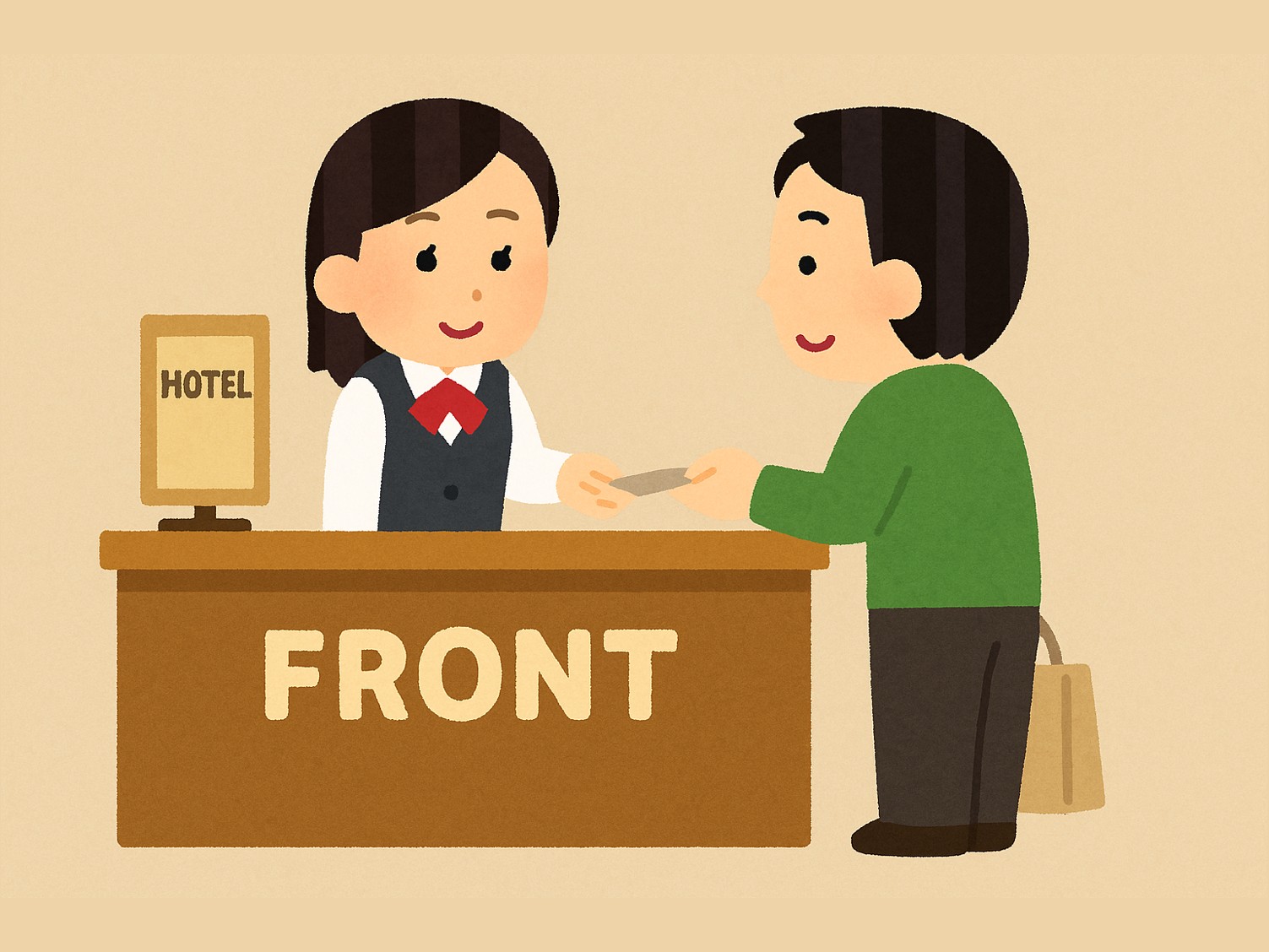 ① ホテルのフロント で受付の際に、お買物券の「引換券」付きのフライヤーを受取ります。