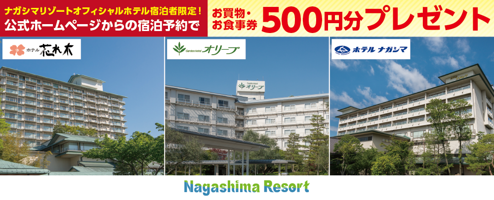 | 特典内容 | 大人 (大人料金) 1名 につき ジャズドリーム長島『500円お買物券(引換券)』1枚配布 ホテルのフロントで「引換券」をお渡しいたします。(引換期限の記載あり) |