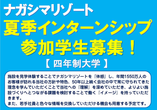 ナガシマリゾートでは四年制大学生の方を対象に、夏季インターンシップ参加者を募集いたします。