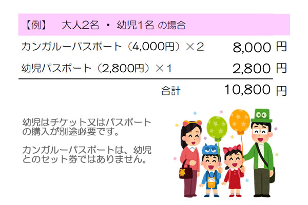大人用カンガルーパスポートは 付き添う 幼児1名 に対し 何名様 でもご購入いただけます。