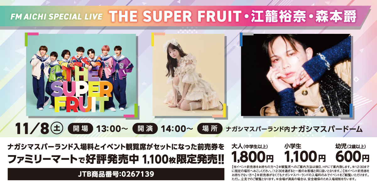 | 内容 | THE SUPER FRUIT、江籠裕奈、森本爵がナガシマスパーランドに登場! この日限定、3組のアーティストによるスペシャルライブで、会場全体を盛り上げます!! |