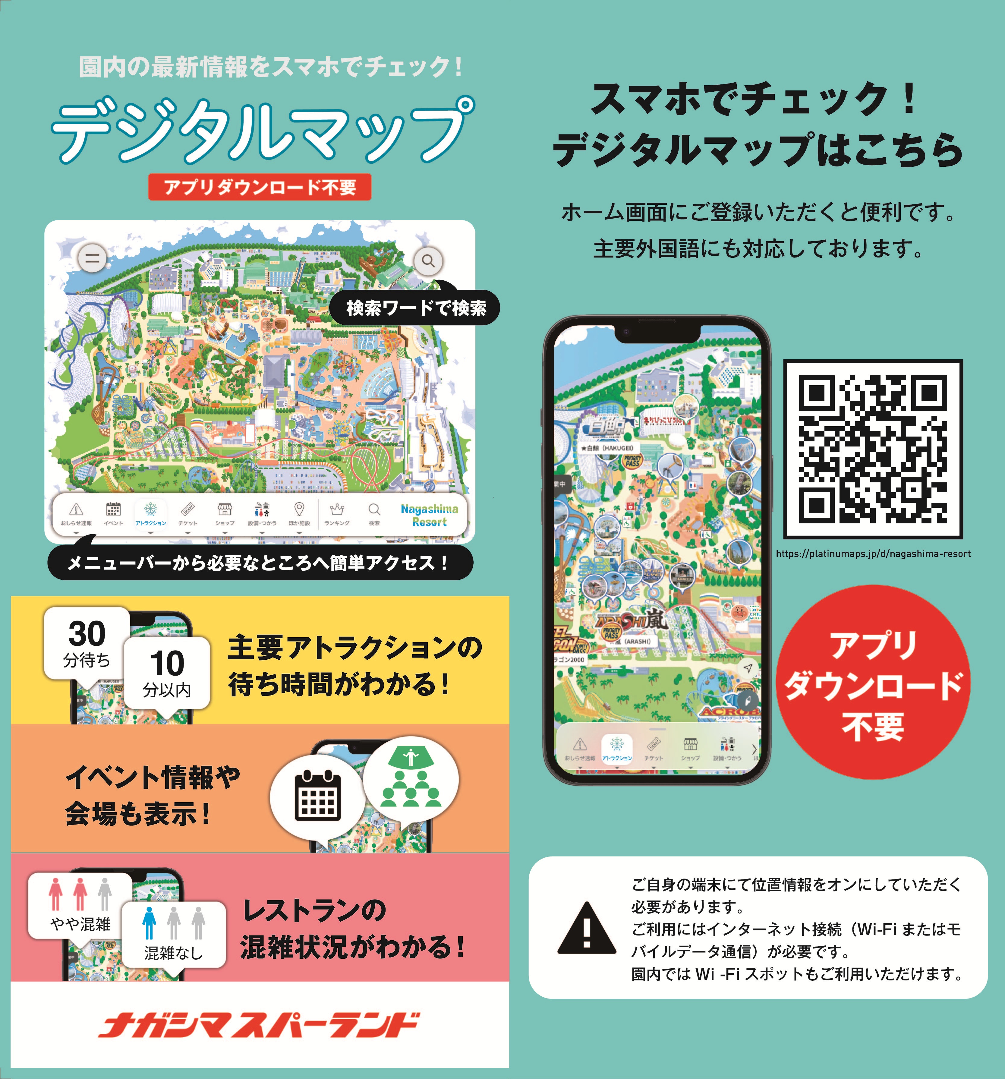 2026年2/27(金)より「ナガシマスパーランド デジタルマップ」ができました!アプリDLや登録や登録不要で、Webブラウザですぐにご覧いただけます。現在位置はもちろん、各施設の場所、各種キーワード検索、主要アトラクションの待ち時間などの混雑状況が手元のスマートフォンですぐにわかるため、より快適で効率的に施設内を回れるようになります。ナガシマスパーランドで、スマートな1日を。