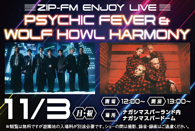 - (1002更新)11/3(月・祝) ZIP-FM公開録音イベント開催!「PSYCHIC FEVER」「WOLF HOWL HARMONY」