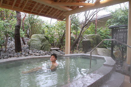 大自然の景観の中、滝の音の響く風情あふれる庭を眺めながら天然一枚岩の湯舟で炭酸泉を楽しむ。炭酸ガスを人工的に溶け込ませて作る「高濃度炭酸泉」で、美肌効果や血行促進などの効能があります。